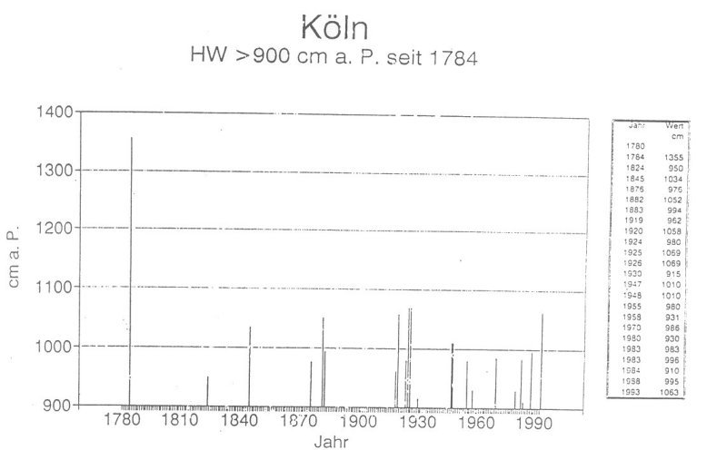 Leitlinien für einen zukunftsweisenden Hochwasserschutz, Stuttgart, November 1995 [2] Internationale Kommission zum Schutze des Rheins (IKSR): Grundlagen und Strategie zum Aktionsplan Hochwasser, Koblenz, Dezember 1995 [3] Schriftenreihe des Internationalen Hansenordens e.V.: Hansen-Blatt Nr.42 August 1989 [4] Mit dem Hochwasser leben Dokumentation einer Fachtagung im Oktober 1995 in Koblenz 1. Auflage 1995, Stein-Verlag Baden-Baden [5] DVWK Schriften 53: Anthropogene Einflüsse auf das Hochwassergeschehen Verlag Paul Parey, 1982 [6] Ministerium für Umwelt, Rheinland-Pfalz: Materialien zum Hochwasserschutz am Rhein, Universität Kaiserslautern Fachgebiet Wasserbau und Wasserwirtschaft Prof. Dr.-Ing G. Koehler Auswirkungen verschiedener anthropogener Veränderungen auf die Hochwasserabflüsse im Oberrheingebiet Mainz, Dezember 1992 [7] Ministerium für Umwelt, Rheinland-Pfalz: Materialien zum Hochwasserschutz am Rhein, Hochwasserstudiengruppe für die Rheinstrecke Kaub-Rolandswerth Der Einfluß des Oberrheinausbaus und der am Oberrhein vorgesehenen Retentionsmaßnahmen auf die Hochwasser am Mittelrhein von Kaub bis Köln Mainz, Dezember 1992 [8] H. Brettschneider / K. Lecher / M. Schmidt: TASCHENBUCH DER WASSERWIRTSCHAFT, 7.Auflage, Verlag Paul Parey, Hamburg und Berlin 1993 [9] W. Schröder / G. Euler / K. Schneider / D. Knauf GRUNDLAGEN DES WASSERBAUS 3., völlig überarbeitete Auflage 1994, Werner Verlag GmbH - Düsseldorf [10] Bericht der Enquete-Kommission, "Verbesserung des Schutzes vor Hochwassergefahren", Berichterstatter: Abgeordneter Alexander Licht MdL Rheinland-Pfalz 12. Wahlperiode, 22.08.1995 [11] StaatsZeitung, Regierungserklärung der Ministerin für Umwelt und Forsten, Klaudia Martini: Hochwasserschutz in Rheinland-Pfalz - Vorsorge treffen für Menschen und Land, Sonderdruck VI/94 [12] Ministerium für Umwelt, Rheinland-Pfalz: Schadstoffbelastung in Böden von Hochwasserüberflutungsflächen des Rheins Mainz, Dezember 1992 [13] Kleine Anfrage des Abgeordneten Wolfgang Schäfer (SPD), und Antwort des Ministeriums für Umwelt Ölschäden durch Überschwemmungskatastrophe Drucksache 12/4276; 02.02.1994 [14] Prof. Dipl.-Ing. G. Petschallies ENTWERFEN UND BERECHNEN IN WASSERBAU UND WASSERWIRTSCHAFT 1.Auflage, Bauverlag GmbH Wiesbaden und Berlin 1989 [15] Caspary, H. J. Veränderungen der Einheitsganglinienparameter infolge neuartiger Waldschäden 5. Wissenschaftliche Tagung Hydrologie und Wasserwirtschaft 1989 Mitteilungen des Institut für Wasserwesen, Universität der Bundeswehr München, H.38,1990 |
