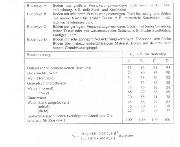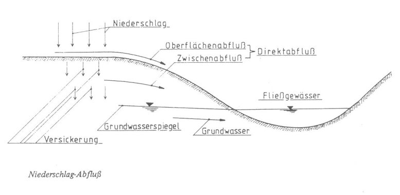 Örtlich und zeitlich verteilt fällt im Einzugsgebiet Niederschlag, der für den Niederschlagsabflußvorgang Voraussetzung ist. Hochwasserauslösende Niederschläge sind für kleine Gebiete kurzzeitige Ereignisse mit hoher Intensität. In großen Flußgebieten müssen die Niederschläge lang andauernd erfolgen und sind dabei von deutlich geringer Intensität. 2.2.2 Abflußbildung Der Niederschlag läßt sich aufteilen in einen Verlustanteil (Verdunstung, Bodenfeuchteanreicherung, Grundwasserzufluß), der nicht oder nicht unmittelbar zum Abfluß gelangt, und einen abflußwirksamen Anteil, den effektiven Niederschlag (Oberflächen- und Zwischenabfluß), der direkt abfließt. Die Senkung der Verlustanteile kann durch Kurz- oder Langfristvorgänge bestimmt sein. Anthropogene Einwirkungen sind langfristige Vorgänge, allen voran die Urbanisierung, mit der Folge dauerhafter Versiegelungen ganzer Oberflächenbereiche. Kurz- bis mittelfristig wirkt die Natur durch Frostversiegelungen oder Vorfüllungen der oberen Bodenschichten infolge langandauernden Regens oder tauenden Schnees. Rechnerische Vergleiche gefallener Niederschläge mit den zugehörigen Gewässerabflußsummen zeigen, daß große Hochwasser nur bei Abflußverhältnissen (a) 0,5 und höher entstehen. In kleinen Einzugsgebieten werden derartige Versiegelungseffekte durch Urbaniesierung erreicht. In großen Einzugsgebieten betreffen anthropogene Versiegelungen einen Flächenanteil von ca. 12%. In Deutschland ergibt sich daraus mit 3% natürlicherweise für die Niederschläge nicht aufnahmefähigen Oberflächen (Fels- und Wasserflächen)ein quasiversiegelter Anteil am gesamten Staatsgebiet von 15%. Großräumig können damit nur Naturversiegelungen die Oberfläche hoch abflußbereit machen. Das Verhältnis zwischen dem aus einem Einzugsgebiet abgeflossenen und gefallenem Niederschlag charakterisiert die Abflußbereitschaft des Einzugsgebietes Abflußverhältnis: a = hA / hN hA - Abflußhöhe [mm], sie ergibt das auf AE bezogene, im Zeitraum T abgeflossene Wasservolumen V an (V/AE). hN - Niederschlagshöhe [mm] Das Abflußverhalten wird zudem von der Bodenart und -nutzung im Einzugsgebiet bestimmt. Nach dem SCS-Verfahren (Soil Conservation Service, USA) können zur Niederschlags-Abfluß Modellierungen CN-Werte abgeschätzt werden. Abflußbbeiwerte: y = hNe / hN hNe - effektive Niederschlagshöhe [mm] hN - Niederschlagshöhe [mm] Die aus einem Regen der Jährlichkeit Tn resultierende Hochwasserwelle kann eine andere Wiederholungszeitspanne aufweisen, wenn extreme Werte für die Abflußbildungsparameter angesetzt werden. Aus einem 10jährlichen Regen kann z.B. bei Vorgabe eines niedrigen Anfangsverlustwertes und/oder eines hohen Abflußbeiwertes eine 50jährliche Welle resultieren. 2.2.3 Abflußkonzentration: Der effektive oder wirksame Niederschlag fließt über Oberfläche, Rinnen, Gräben und Hauptvorfluter direkt ab. Die Gesamtabflußganglinie beinhaltet außer diesen Direktabfluß auch einen aus dem Grundwasserspeicher und sonstigen "Quellen" (Speicher, Kläranlagen..) resultierenden Abflußanteil, den verhältnismäßig kleinen Basisabfluß, der auch vorhanden gewesen wäre, wenn es nicht geregnet hätte. Ausbaumaßnahmen an Gewässern haben häufig zu Hochwasserverschärfungen geführt. Die Gründe hierfür sind Laufverkürzung und Retentionsverluste. Zudem kommen Änderungen an der Bodenoberfläche im Zusammenhang mit der landwirtschaftlichen Nutzung (Entwässerungen, Wegebau und Flurbereinigung).