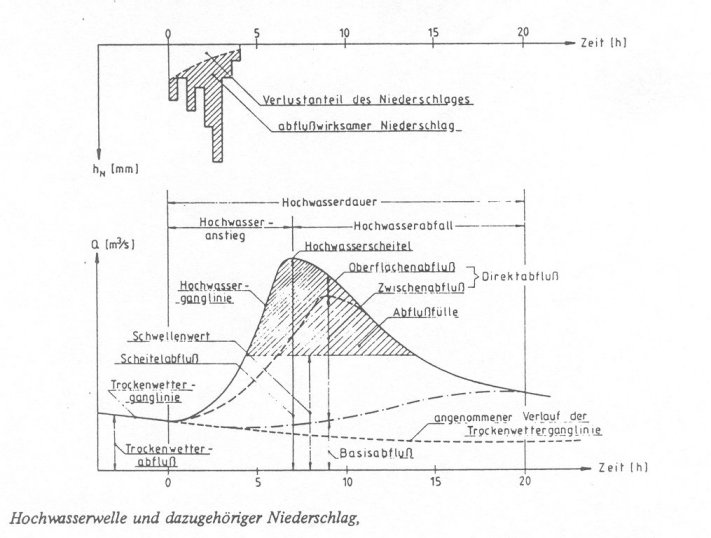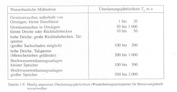 Feuerbrünste, Überschwemmungen, Erd- und Seebeben, Wirbelstürme, Vulkanausbrüche und Erdrutsche: zu allen Zeiten haben Naturkatastrophen die Menschen heimgesucht. Es scheint, als ob die Elemente Feuer, Wasser, Wind in einem ständigen makabren Wett streit miteinander lägen, wer denn nun die stärkste Urgewalt sei. Das Wasser, andererseits Born allen Lebens, hält wohl den Negativrekord: es hat ganze Flußläufe (einst auch den Niederrhein), ja Landstriche verändert, und die schrecklichsten Naturkatastrophen sind in der Tat durch Flussüberschwemmungen, vor allem in China, verursacht worden. 1911 starben im Hochwasser des Jangtsekiang über 100.000, in denen des Hoangho 1931 gar 150.000 Menschen, und geradezu unvorstellbar mutet uns die Katastrophe von 1887 an, als 900.000 Menschen in den Tod riss und Millionen obdachlos machte. Solche Flussüberschwemmungen haben also mehr Tote verursacht als die Taifune im Pazifik und an den Küsten Asiens, die Hurrikane und Tornados in der Karibik und die periodischen Monsunregen in Südostasien. Katastrophale Auswirkungen auf engbegrenztem Raum haben die sogenannten Unwetterhochwasser. Unvergessen bleibt der 22.5.1971 mit einem sechsstündigen Gewitterregen, bei dem in St. Goarshausen der vergleichsweise winzige Forstbach sein Bett sprengte und zu einem schäumenden Wildwasser anschwoll, das mehrere Häuser schwer beschädigte und zahlreiche Autos in den Rhein spülte. Es scheint heute noch wie ein Wunder, daß damals keine Menschen, die sich in halsbrecherischer Flucht über Nachbardächer in Sicherheit bringen mussten, zu Schaden kamen. [3] 1.2 Grundlagen Während der niederschlagsfreien Zeit werden die größeren Fließgewässer durch Grundwasser gespeist (Trockenwetterabfluss). Niederschläge führen zu einem Anstieg der Abflüsse. Stärkere Niederschläge verursachen Hochwasserwellen. Die Abflüsse einer Hochwasserwelle setzen sich aus den Direktabflüssen der Niederschläge und aus den Basisabflüssen zusammen. Die Basisabflüsse sind die zufließenden Grundwassermengen, die in der Regel während der Hochwasserzeit ansteigen. Die Direktabflüsse lassen sich in die Oberflächenabflüsse und die Zwischenabflüsse untergliedern. Die Zwischenabflüsse gelangen auf unterirdischen Fließwegen verzögert ins Fließgewässer, ohne das Grundwasser zu berühren. Die Oberflächenabflüsse er- reichen das Fließgewässer auf kürzesten Wegen und entsprechend in der kürzesten Zeit. Der größte Abfluß einer Hochwasserwelle heißt Scheitelabfluß. Der Scheitelabfluß einer bestimmten Welle bildet die Grundlage für die Bemessung der Hochwasserentlastungsanlage. Für die Ermittlung des gewöhnlichen Rückhalteraumes wird die Abflußfülle einer anderen Welle benötigt. Die Abflußfülle ist die Abflußsumme oberhalb eines Schwellenwertes. Der Schwellenwert kann variabel sein. Er entspricht der geplanten Wasserabgabe an die Unterwasserstrecke des Fließgewässers während des Hochwassers. Die maßgebende Abflußfülle ist so groß zu wählen, daß sie in der gewählten Wiederholungszeitspanne nur einmal erreicht wird. Die Wiederholungszeitspanne (Jährlichkeit Tn) hängt von der Schutzbedürftigkeit der Flächen unterhalb des Beckens ab. Bei kleiner werdender Schutzbedürftigkeit sinken die Wiederholungszeitspannen. Die geeignete Wiederholungszeitspanne für die Bemessung des gewöhnlichen Hochwasserrückhalteraumes gehört zu einem Hochwasser, für das sich nach dem Abzug der Beckenbaukosten der größte finanzielle Nutzen infolge der Rückhaltung ergibt. Diese Wiederholungszeitspanne und das dazugehörige Hochwasser werden durch die oben geschilderten Kosten-Nutzen-Untersuchungen, die für eine größere Anzahl von Wiederholungszeitspannen durchgeführt werden müssen, gefunden. Bei Verzicht auf Kosten-Nutzen-Untersuchungen besteht die Möglichkeit, die maßgebende Wiederholungszeitspanne der Tabelle zu entnehmen. ![]() Stehen zur Entwicklung der Bemessungshochwasserwellen Abflußbeobachtungsdaten zur Verfügung, so werden sie statistisch ausgewertet. Sind keine Abflußbeobachtungswerte vorhanden, so besteht die Möglichkeit, die maßgebenden Bemessungshochwasserwellen in Abhängigkeit von Niederschlagsdaten, die der Deutsche Wetterdienst liefert zu ermitteln. [14]