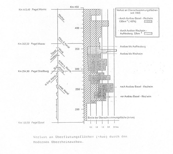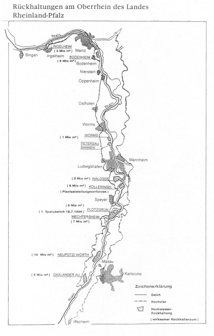 Am Beginn steht die Rheinkorrektion von TULLA im 19. Jahrhundert. Nach seinen Plänen und ersten Arbeiten ist in den Jahren 1840 bis 1884 zwischen Basel (Rhein-km 170) und der Murgmündung (Rhein-km 345) anstelle des verästelten Wildstromes ein einheitliche, regelmäßiges Rheinbett geschaffen worden. Zahlreiche Flußschleifen wurden durchstochen und abgeschnitten. Die Rheinkorrektion hat den Talweg wesentlich verkürzt und das Gefälle vergrößert. Dadurch hat es auf langen Strecken zu Eintiefungen der Stromsohle gekommen. Auch auf der Rheinstrecke zwischen Worms und Kaub sind seit dem vorigen Jahrhundert große Flußbauarbeiten ausgeführt worden. Der Verlauf des Rheinbettes in dieser Strecke war im großen und ganzen bereits zu Beginn des 19. Jahrhunderts wesentlich gestreckter als oberhalb Worms. Die einzige ausgeprägte Stromschleife bei Erfelden hat KRÖNCKE schon 1828/29 mittels Durchstiches begradigt, wodurch der Stromlauf 10,5 km kürzer geworden ist. In der zweiten Hälfte des 19. Jahrhunderts sind durch Trenndämme (Leitwerke) und Baggerungen bei Worms, Gernsheim, Oppenheim, Mainz, Rüdesheim und Bingen geschaffen worden. Dabei wurde das Hochwasserprofil eingeengt. Auen wurden mit dem Ufer verbunden, um Häfen auszubauen (Ingelheimer Aue). Im zeitlichen Zusammenhang mit dem Ausbau der Häfen wurden zwischen Worms und Kaub Mittelwasserregulierungen durchgeführt, um eine größere Fahrwassertiefe für die Schiffahrt zu gewinnen. Auf der Rheinstrecke Worms-Mainz wurden in den Jahren 1890 bis 1908 zahlreiche Buhnen gebaut. Zwischen Bingen und Kaub hat es hochstehende Felsrippen im Strom gegeben. Sie sind sehr gefährliche Hindernisse für die Schiffahrt gewesen und haben zahlreiche Unfälle, besonders im "Binger Loch" verursacht. Hier ist die bis 1830 nur 7 bis 9 m breite schiffbare Öffnung in den durchgehenden Felsrippen schrittweise verbreitert worden. Heute bestehen im Binger Loch 120 m breite Fahrrinnen, die einen ungefährdeten Schiffsverkehr erlauben. Als Folge von Regulierungsarbeiten traten auch zwischen Worms und Bingen Erosionen der Stromsohle ein. Sie hatten Veränderungen der Höhenlage von Wasserspiegeln bei gleichen Abflüssen zur Folge. 2.1.2 Bau von Deichen Zum Schutz der Rheinniederungen gegen Hochwasser sind zwischen Worms und Mainz, stellenweise auch unterhalb davon, Deiche gebaut worden. Ihre Lage ist seit der Mitte des 19. Jahrhunderts nahezu unverändert geblieben. Nach der Hochwasserkatastrophe 1882/83 wurde zur Verbesserung des Hochwasserschutzes ein einheitlicher Deichentwurf aufgestellt. Zugrunde lagen die an den Dämmen und Landmarken bei diesem Hochwasser festgestellten höchsten Rheinwasserspiegel. Die Dammkronen wurden 20 cm darüber angeordnet. Nach diesem Entwurf wurden die Hochwasserdämme linksrheinisch zwischen Worms und Oppenheim von 1932 bis 1936 und rechtsrheinisch zwischen Hofheim und Stockstadt/Erfelden von 1956 bis 1960 erhöht und verstärkt. Auch danach fanden Deichbauarbeietn statt. Im Hinblick auf die durch den Oberrheinausbau gestiegene Hochwassergefahr wurden in Hessen weitere Verstärkungen am Winterdeichsystem in Angriff genommen; diese sind noch nicht abgeschlossen. Auch für den Rheinabschnitt zwischen Worms und der Mainmündung wurden in der Vereinbarung von 1991 zwischen den Ländern Baden-Württemberg, Hessen und Rheinland-Pfalz Obergrenzen für die Höhen des beidseitigen Deichsystems festgelegt, um links- und rechtsrheinisch das Niveau für einen gleichwertigen Hochwasserschutz langfristig festzuschreiben. Den Hauptdeichen, die das Winterhochwasser abhalten, sind teilweise Sommerdeiche vorgelagert. Im allgemeinen liegt die Krone 1 m tiefer als die der Winterdeiche. Die Flächen zwischen den Deichen sind gegen die meisten Hochwasser geschützt, werden aber bei großen Hochwassern überflutet, insbesondere im Winter. Zwischen den Sommer- und Winterdeichen sind dann Retentionsräume für überlaufendes Hochwasser vorhanden. Die Retention hinter den Sommerdeichen mindert die überlaufenden Hochwasser ab. Sie ist besonders wirksam, wenn die Hochwasserscheitel die Deichkronen nur um wenige Dezimeter und für nicht lange Zeit überschreiten. Daher ist die Beibehaltung der Sommerdeiche für die Dämpfung kleiner und mittlerer Hochwasser zwingend geboten.
