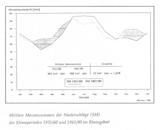Die Bebauung einer Fläche bedeutet die Versiegelung eines Teils dieser Fläche, so daß die Teilnahme des Bodens am Wasserkreislauf nicht mehr möglich ist: keine Versickerung, keine Transpiration, keine Speicherung. Statt dessen werden glatte Oberflächen geschaffen, die wie ein Trichter das Niederschlagswasser sammeln und, da keine natürlichen Fließwiderstände vorhanden sind, es meist durch eine Kanalisation direkt und schnell ohne große Verluste dem Vorfluter am Rande der bebauten Fläche zuführen. Dieses Abflußverhalten führt dazu, daß auch Niederschlagsereignisse mittlerer Intensität beachtliche Hochwasserabflüsse zur Folge haben können. Die Kombination der erhöhten Abflußbereitschaft bei kürzerer Fließzeit steigert das Abflußpotential eines Einzugsgebietes. [5] 2.3.2 Waldsterben Die ersten anthropogenen Einflüsse größeren Ausmaßes ergaben sich im Rheingebiet schon vor Jahrhunderten durch großflächige Entwaldungen. Dies führte zu einer Beschleunigung der Abflußbildung in Richtung Oberflächenabfluß. Bei der Änderung des Abflußverhaltens von Wald-Einzugsgebieten infolge möglicher Waldschäden sind, zwei Teilprozesse des Niederschlag-Abfluß-Vorgangs zu berücksichtigen: Die Veränderung der Abflußfüllen bzw. Abflußbeiwerte (Prozess der Abflußbildung) und die Veränderung des zeitlichen Ablaufs der Hochwasserwellen (Prozess der Abflußkonzentration). Qualitativ ist zu erwarten, daß mit Zunahme der Waldschäden die Abflußfüllen größer werden und die Hochwasserwellen schneller ablaufen und höhere Scheitelwerte erreichen. Diese Effekte konnten bisher an Hand von langjährigen Meßreihen nicht sicher nachgewiesen werden, vor allem wohl, weil die Waldschäden bisher noch nicht ein entsprechendes Ausmaß angenommen haben. Erste Hinweise auf solche Auswirkungen für ein Einzugsgebiet im Schwarzwald ergeben sich aus Untersuchungen von Caspary [15] 2.3.3 Klimaveränderung Zunehmend werden derzeit die Möglichkeiten einer globalen Klimaveränderung im Ergebnis des anthropogenen Treibhauseffekt diskutiert. Aus dem Begriff "Klima", der den durchschnittlichen Witterungsverlauf an einem Ort über eine hinreichend lange Zeit bezeichnet, folgt bereits die Problematik des Nachweises derartiger Veränderungen: die erforderlichen Meß- und Beobachtungsreihen sind derzeit noch zu kurz und zudem nicht in der erforderlichen räumlichen Dichte vorhanden. Vor dem Hintergrund natürlichen Variabilität klimatischer Größen können die etwaigen Veränderungen damit nur durch Modellrechnungen abgeschätzt werden. Aufgrund der großen Komplexität dieser Prozesse sind Aussagen zu regionalen Klimaveränderungen derzeit nicht möglich. Trotzdem finden sich in zunehmender Zahl Veröffentlichungen, in denen die Veränderungen der hydrologischen und, daraus folgernd, wasserwirtschaftlichen Verhältnisse im Ergebnis einer Klimaveränderung regional spezifisch diskutiert werden.