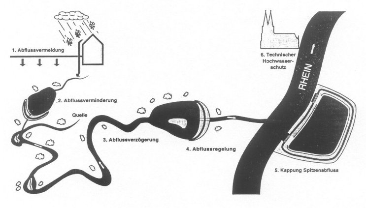Wenn Hochwasser über mehrere Jahrhunderte zurück betrachtet werden, so wäre mit solchen Hochwassern, wie sie zuletzt eintraten, zu rechnen gewesen. Allerdings war es nicht möglich, den Zeitpunkt bzw. das Jahr des Auftreten vorherzusagen. Fast zwanzig Jahre ohne größere Hochwasserkatastrophen haben Bevölkerung und Politiker die Gefahren vergessen lassen. Trotz Warnungen der Fachbehörden und der Wissenschaft sind potentielle Überschwemmungsgebiete hochwertig genutzt worden, ja so hochwertig, daß immense Schäden bei den Hochwasserereignissen der letzten Zeit aufgetreten sind. Nach Aussage der Wissenschaft ist in der Zukunft weiterhin mit größeren Hochwassern zu rechnen, und zwar auch mit noch größeren als die bisherigen und dies, auch wenn keine anthropogene bedingte Klimaveränderung zu erwarten ist. Viele Gebiete können nicht vor Hochwasser geschützt werden. Andere Gebiete können nur zum Teil geschützt werden. Es wird kaum möglich sein, einen absoluten Hochwasserschutz gegen das denkbar größte Hochwasserereignis zu schaffen. So muß man sich fragen, ob die Zielsetzung Hochwasserschutz überhaupt richtig ist. Muß nicht die Zielsetzung Hochwasserschadensminimierung sein? Da technische Hochwasserschutzmaßnahmen erst in Jahren greifen werden und dann auch nur einen bedingten Hochwasserschutz bieten, müssen den vielen anthropogen Ursachen mit genauso vielfältigen Maßnahmen, die zudem zur Bewahrung und Verbesserung der Umwelt insgesamt dienen, begegnet werden. Somit führt wohl kein Weg daran vorbei, sich darauf einzustellen, mit dem Hochwasser zu leben.