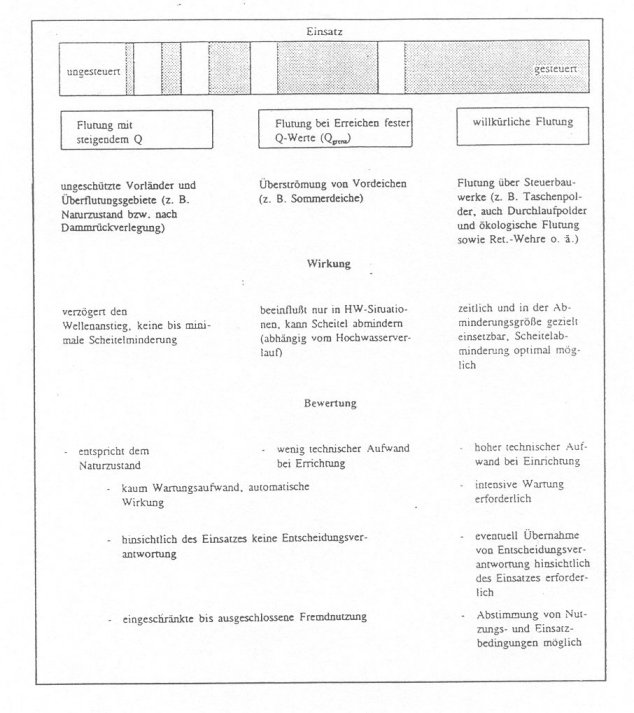Polder und Hochwasserrückhaltebecken haben die ausschließliche Funktion, vorübergehend Hochwasserabflüsse aufzunehmen. Zwar ist das Sperrbauwerk eines Hochwasserrückhaltebeckens in der Regel eine Talsperre, aber von der Funktion und Aufgabe her ist es ein Element des Flußbausbaues, der Flußregelung, das nur im Zusammenhang mit dem Flußausbauplan gesehen werden kann. Die gegenseitige Abstimmung der Größe der Becken mit der möglichen oder gewünschten Größe des Ausbauprofils einer Flußstrecke ist nötig, da die Stauräume maßgeblich den Ausbauabfluß beeinflussen. Bei reinen Hochwasserrückhaltebecken gilt es zu unterscheiden zwischen · Rückhaltebecken ohne jeden Gewässerausbau. Dann, wenn Ausbau, Unterhaltung, Folgemaßnahmen kostspieliger sind, als das Beschaffen entsprechend großer Hochwasserschutzräume, oder wenn der Ausbau ein störender Eingriff in die Landschaft wäre, oder wenn Hochwasserrückhaltebecken Folgemaßnahme einer Abflußver- schärfung im Oberlauf ist. · Rückhaltebecken mit teilweisem Ausbau des Wassserlaufs. Beschränkter Ausbau ist immer dann sinnvoll, wenn das Hochwasserrückhaltebecken beispielsweise vor den besonders häufigen Sommerhochwässern schützen kann, aber nicht genügend gegen extreme Hochwasser. · Rückhaltebecken zum Rückhalt katastrophaler Hochwassserabflüsse bei bereits weitgehend auf Hochwasser ausgebauter Wasserläufe. Diese Rückhaltebecken werden stets dann gebaut, wenn im Unterlauf unterhalb von Siedlungen Engpässe vorliegen. Hochwasserrückhaltebecken können Nebenaufgaben erhalten und werden damit zu Mehrzweckanlagen. Nebenaufgaben können sein: Aufhöhen des Niedrigwasserabflusses, Grundwasseranreicherung, das Errichten von Seen in Erholungs- und Naturschutzgebieten. Auch die landwirtschaftliche Nutzung der Bodenfläche ist möglich und zwar als Grünland, als Ackerland oder Auwald. Die Nutzungswert richtet sich nach der Einstauhäufigkeit und der Jahreszeit des Einstaues. Beim Betrieb der Hochwasserrückhaltebecken spielt das Verhalten des beherrschbaren zum unbeherrschbaren Stauraum eine besondere Rolle. Entsprechend sind Grundablaß und Hochwasserentlastungsanlage sowohl von der Art und der Größe auszuwählen. Nach der Betriebsweise kann man unterscheiden: · Nichtsteuerbare, automatisch arbeitende Hochwasserrückhaltebecken; dies sind meistens Kleinspeicher, die sich nach dem Prinzip der Seeretention füllen und entleeren. Im Absperrdamm befindet sich ein Betriebsauslaß bestimmter, unveränderlicher Größe. Eine Schutzwirkung ist nur dann gegeben, wenn das Becken groß genug ist und das Hochwasser aufnehmen kann. · Automatisch gesteuerte Hochwasserschutzbecken mittlerer Größe, meist im Verbund mit einem Mehrbeckensystem. Betriebsauslaß und Hochwasserentlastungsanlage sind entsprechend konstruktiv ausgebildet. Sie werden in dem im Voraus festgelegten Umfang eingesetzt. · Vollgesteuerte Hochwasserschutzbecken mit größerem oder großen Speicherinhalten von mehreren Hektokubikmetern. Der Betrieb wird den jeweiligen hydrologischen Gegebenheiten angepaßt. Die Betriebsweise der Rückhaltebecken hängt entscheidend von der Beckengröße ab. Es sind drei Fälle möglich: der Beckeninhalt ist größer, gleich oder kleiner als das jeweils zurückzuhaltende Wasservolumen. Der letzte Fall, der am häufigsten vorkommt, ist schwierig zu bewirtschaften; er läßt sich auf zwei Arten steuern: · Der zulässige Ausfluß wird solange zurückgehalten, bis das Becken gefüllt ist und die Hochwasserentlastung anspringt. Durch diese automatische Steuerung ohne Beachtung des Zuflusses kann nur eine geringe Fülle des Hochwasserscheitels zurückgehalten werden. · Der Zufluß wird beobachtet, die Steuerung des Abflusses setzt nach einer Hochwasservorhersage ein. Durch Vorentlastung, die sich der Zuflußsituation schrittweise angepaßt und dabei erträglich für den Unterlauf ist, wird der größte Teil des Hochwasserrückhalteraumes für die Fülle des Hochwasserscheitels freigemacht. [9] Zum weiteren zählen Deiche, Hochwasserpumpwerke sowie die vielfältigen angebotenen mobilen Wände zum technischen Hochwasserschutz (siehe Ausstellerverzeichnis). Technischer Hochwasserschutz ist nicht billig. Der Schutzgewinn muß den Aufwand rechtfertigen. Diese Rechtfertigung ist um so schwieriger, je höher das Ziel gesteckt wird. Gleichzeitig ist Rechenschaft abzulegen, wie sich der Eingriff auf Oberlieger und Unterlieger auswirkt. Hochwasserschutz ist öffentliche Infrastruktur wie Straßen, Energieversorgung und Telekommunikation zum Nutzen der Bürger, ohne garantierte Sicherheit bei Überschreiten der vereinbarten Leistung. Auch nach dem Bau einer Hochwasserschutzeinrichtung bleibt der dahinterliegende Raum dem Grunde nach Bestandteil des natürlichen Überschwemmungsgebietes, wenn auch bis zum Bemessungsfall für den Einzelnen verbesserte Nutzungsmöglichkeiten gegeben sind.